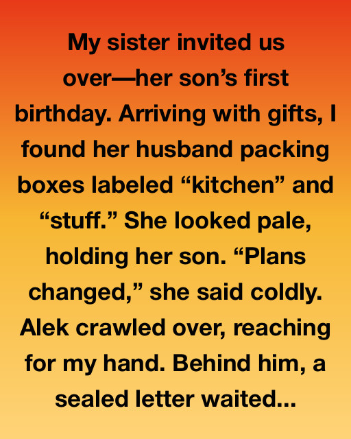 My sister invited us overโher sonโs first birthday. Arriving with gifts, I found her husband packing boxes labeled โkitchenโ and โstuff.โ She looked pale, holding her son. โPlans changed,โ she said coldly. Alek crawled over, reaching for my hand. Behind him, a sealed letter waited.