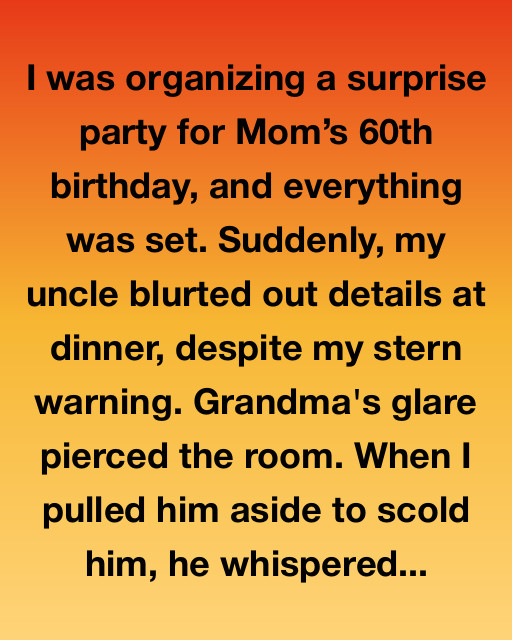 I was organizing a surprise party for Mom’s 60th birthday, and everything was set. Suddenly, my uncle blurted out details at dinner, despite my stern warning. Grandma’s glare pierced the room. When I pulled him aside to scold him, he whispered that he had a plan to cover up his blunder.