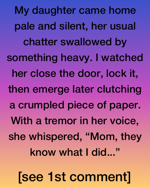 My daughter came home pale and silent, her usual chatter swallowed by something heavy. I watched her close the door, lock it, then emerge later clutching a crumpled piece of paper. With a tremor in her voice, she whispered, “Mom, they know what I did…”