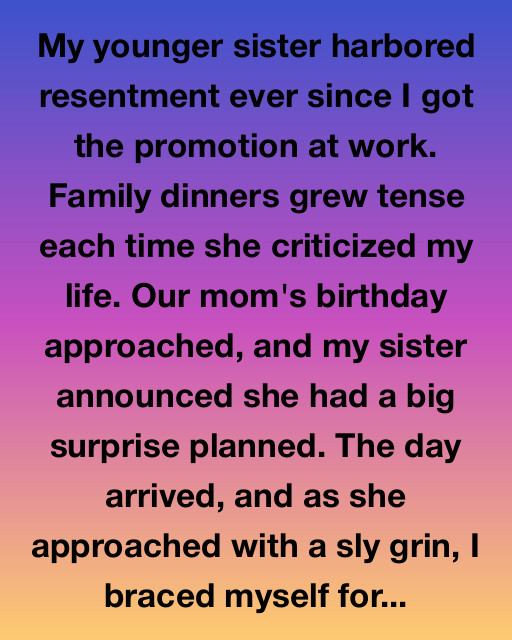 My younger sister harbored resentment ever since I got the promotion at work. Family dinners grew tense each time she criticized my life. Our mom’s birthday approached, and my sister announced she had a big surprise planned. The day arrived, and as she approached with a sly grin, I braced myself for another dig at my success.