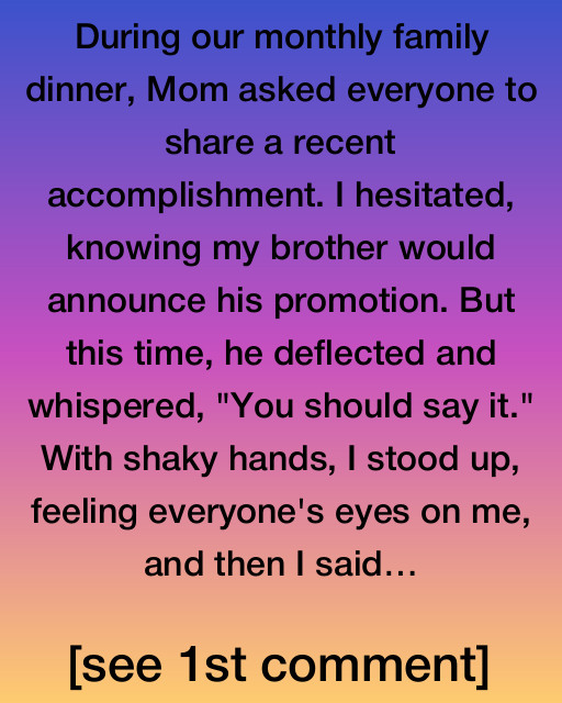 During our monthly family dinner, Mom asked everyone to share a recent accomplishment. I hesitated, knowing my brother would announce his promotion. But this time, he deflected and whispered, “You should say it.” With shaky hands, I stood up, feeling everyone’s eyes on me, and then I said, “I wrote a song thatโs going to be played on the local radio station next week.” I watched as surprise turned to pride in their eyes.