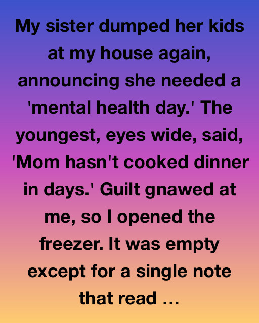 My sister dumped her kids at my house again, announcing she needed a ‘mental health day.’ The youngest, eyes wide, said, ‘Mom hasn’t cooked dinner in days.’ Guilt gnawed at me, so I opened the freezer. It was empty except for a single note that read, ‘Hope you find what’s missing.’ My heart ached, knowing Jade was struggling more than she let on.