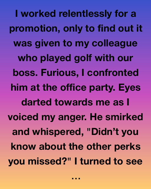 I worked relentlessly for a promotion, only to find out it was given to my colleague who played golf with our boss. Furious, I confronted him at the office party. Eyes darted towards me as I voiced my anger. He smirked and whispered, “Didnโt you know about the other perks you missed?” I turned to see our boss in conversation with the top executives, laughing like old friends.