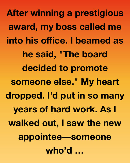 After winning a prestigious award, my boss called me into his office. I beamed as he said, “The board decided to promote someone else.” My heart dropped. I’d put in so many years of hard work. As I walked out, I saw the new appointeeโsomeone whoโd just joined the company a year ago. A mixture of disbelief and frustration bubbled up inside me, and I couldn’t quite shake off the sting of disappointment.