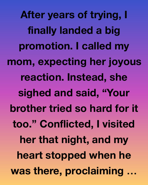 After years of trying, I finally landed a big promotion. I called my mom, expecting her joyous reaction. Instead, she sighed and said, โ€œYour brother tried so hard for it too.โ€ Conflicted, I visited her that night, and my heart stopped when he was there, proclaiming that he had been overlooked once again.