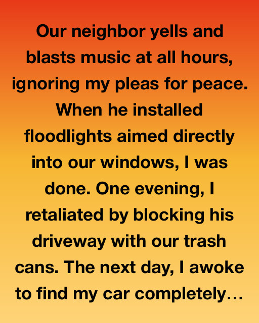 Our neighbor yells and blasts music at all hours, ignoring my pleas for peace. When he installed floodlights aimed directly into our windows, I was done. One evening, I retaliated by blocking his driveway with our trash cans. The next day, I awoke to find my car completely covered in colorful graffiti, a bewildering collage of swirling patterns and illicit appeals.
