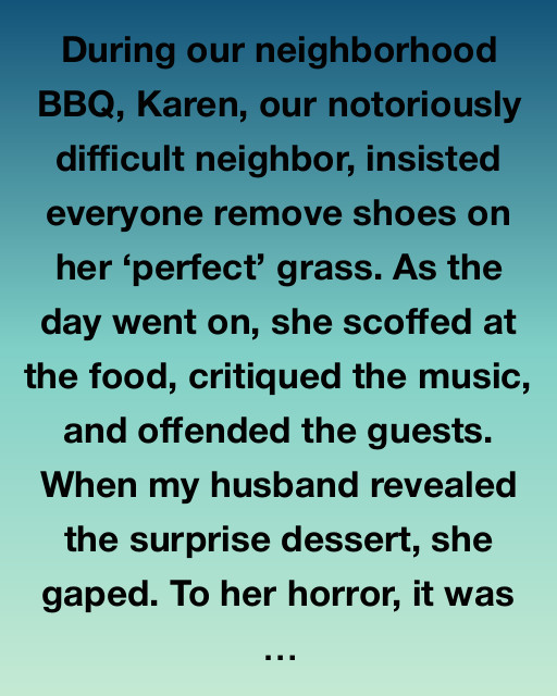 During our neighborhood BBQ, Karen, our notoriously difficult neighbor, insisted everyone remove shoes on her โ€˜perfectโ€™ grass. As the day went on, she scoffed at the food, critiqued the music, and offended the guests. When my husband revealed the surprise dessert, she gaped. To her horror, it was pineapple upside-down cake, which Karen detested openly, calling it โ€œpeasant food.โ€
