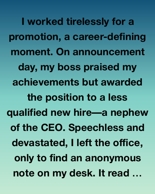 I worked tirelessly for a promotion, a career-defining moment. On announcement day, my boss praised my achievements but awarded the position to a less qualified new hire—a nephew of the CEO. Speechless and devastated, I left the office, only to find an anonymous note on my desk. It read, “Keep your head up; better things are coming your way. Don’t lose hope.”