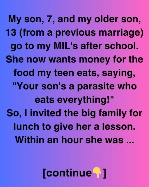 My son, 7, and my older son, 13 (from a previous marriage) go to my MIL’s after school. She now wants money for the food my teen eats, saying, “Your son’s a parasite who eats everything!” So, I invited the big family for lunch to give her a lesson. Within an hour she was sitting stiffly at the table, her tight smile faltering as dishes kept appearing—each one more generous than the last.