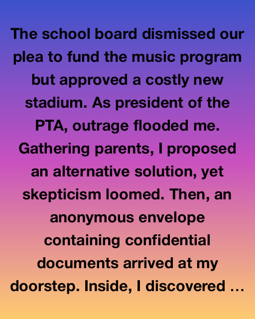 The school board dismissed our plea to fund the music program but approved a costly new stadium. As president of the PTA, outrage flooded me. Gathering parents, I proposed an alternative solution, yet skepticism loomed. Then, an anonymous envelope containing confidential documents arrived at my doorstep. Inside, I discovered spreadsheets showing discrepancies in the budget. Clearly, something seemed amiss with the school board’s priorities and its financial decisions.
