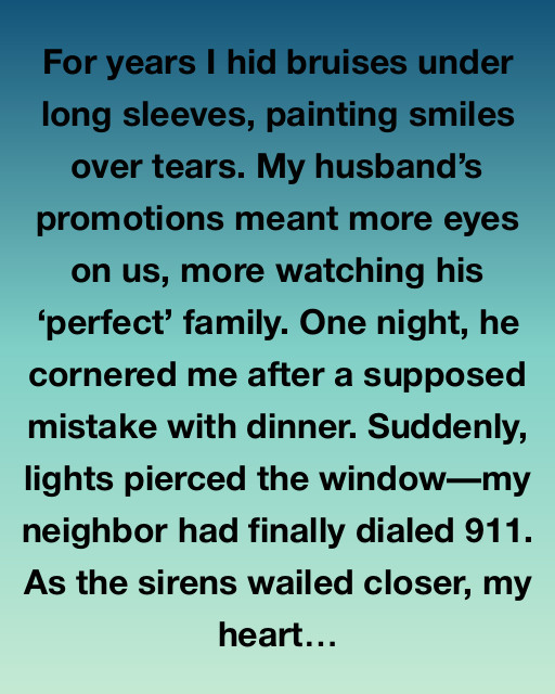 For years I hid bruises under long sleeves, painting smiles over tears. My husband’s promotions meant more eyes on us, more watching his ‘perfect’ family. One night, he cornered me after a supposed mistake with dinner. Suddenly, lights pierced the window—my neighbor had finally dialed 911. As the sirens wailed closer, my heart raced with dread and hope.