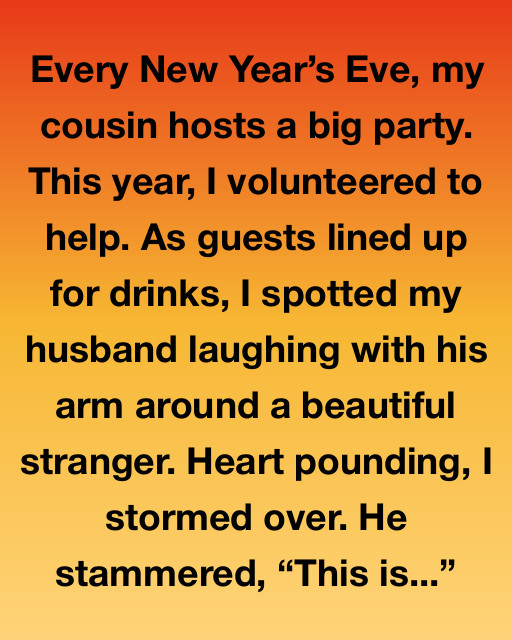 Every New Yearโs Eve, my cousin hosts a big party. This year, I volunteered to help. As guests lined up for drinks, I spotted my husband laughing with his arm around a beautiful stranger. Heart pounding, I stormed over. He stammered, โThis is…โ