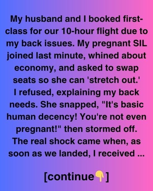 My husband and I booked first-class for our 10-hour flight due to my back issues. My pregnant sister-in-law joined last minute, whined about economy, and asked to swap seats so she can “stretch out.” I refused, explaining my back needs. She snapped, “It’s basic human decency! You’re not even pregnant!” then stormed off. The real shock came when, as soon as we landed, I received a text from my mother-in-law that simply read: “We need to talk. Call me when you’re free.”