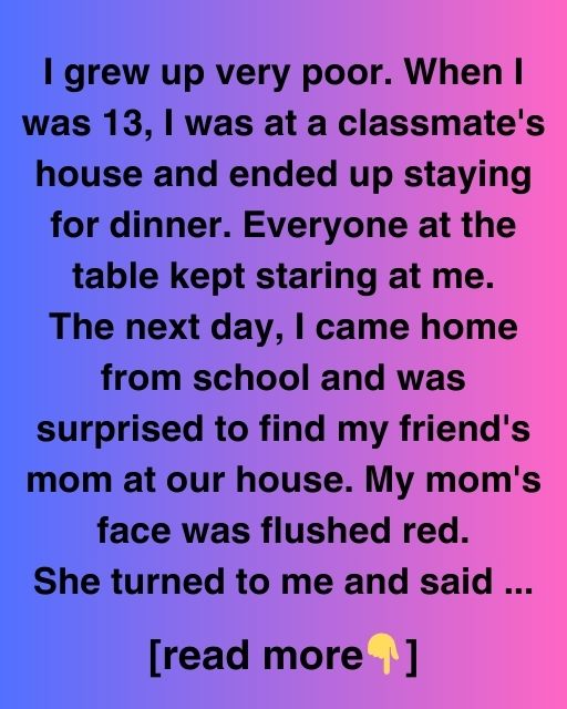 I grew up very poor. When I was 13, I was at a classmate’s house and ended up staying for dinner. Everyone at the table kept staring at me. The next day, I came home from school and was surprised to find my friend’s mom at our house. My mom’s face was flushed red. She turned to me and said, โDid you take food from their pantry?โ