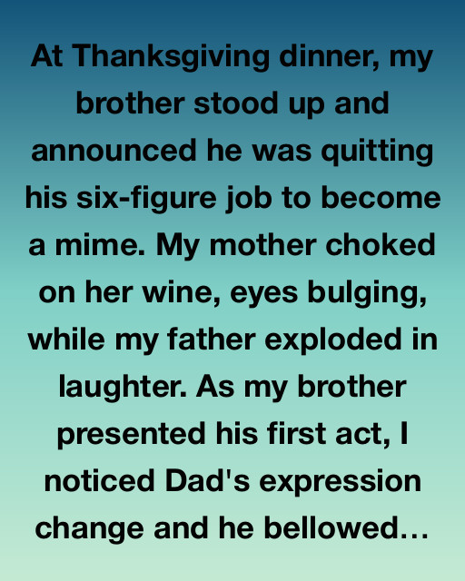 At Thanksgiving dinner, my brother stood up and announced he was quitting his six-figure job to become a mime. My mother choked on her wine, eyes bulging, while my father exploded in laughter. As my brother presented his first act, I noticed Dad’s expression change and he bellowed uncontrollably. “A mime! Joshua, have you lost it?” he uttered between fits of giggles, tears streaming down his face.
