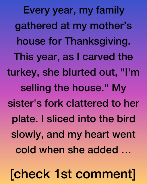 Every year, my family gathered at my motherโs house for Thanksgiving. This year, as I carved the turkey, she blurted out, “I’m selling the house.” My sister’s fork clattered to her plate. I sliced into the bird slowly, and my heart went cold when she added, “Iโm moving to Chicago with Gerard.” Her words hung heavy in the air, filling the room with a dense and unexpected silence. We had met Gerard only once, a quiet afternoon visit that seemed perfectly pleasant but brief.