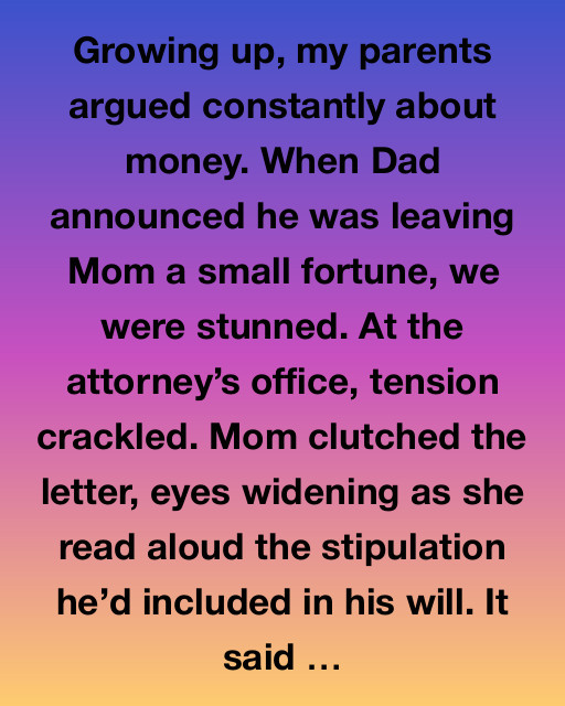 Growing up, my parents argued constantly about money. When Dad announced he was leaving Mom a small fortune, we were stunned. At the attorney’s office, tension crackled. Mom clutched the letter, eyes widening as she read aloud the stipulation he’d included in his will. It said she could receive the fortune only if she formed a lasting friendship with someone new.