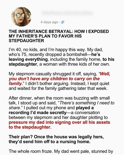 The Inheritance Betrayal: How I Exposed My Fatherโs Plan To Favor His Stepdaughter