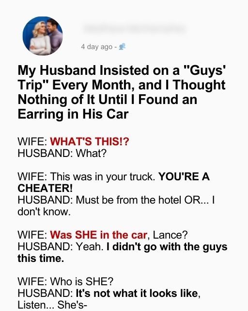 My Husband Insisted on a ‘Guys’ Trip’ Every Month, and I Thought Nothing of It Until I Found an Earring in His Car