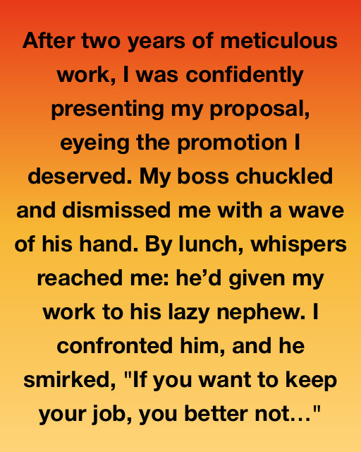 After two years of meticulous work, I was confidently presenting my proposal, eyeing the promotion I deserved. My boss chuckled and dismissed me with a wave of his hand. By lunch, whispers reached me: he’d given my work to his lazy nephew. I confronted him, and he smirked, “If you want to keep your job, you better not make a fuss.”