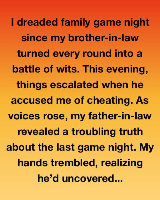 I dreaded family game night since my brother-in-law turned every round into a battle of wits. This evening, things escalated when he accused me of cheating. As voices rose, my father-in-law revealed a troubling truth about the last game night. My hands trembled, realizing he’d uncovered something that had been hidden.