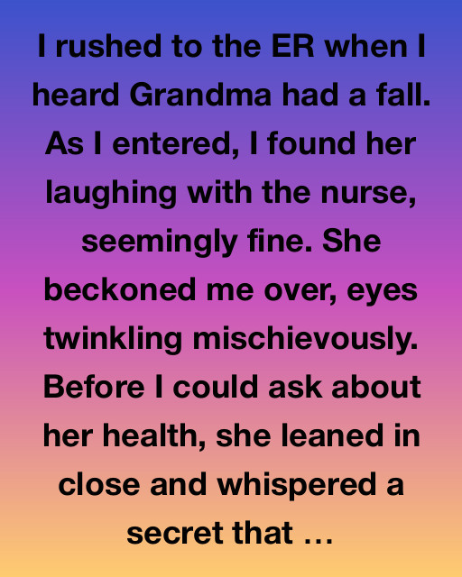 I rushed to the ER when I heard Grandma had a fall. As I entered, I found her laughing with the nurse, seemingly fine. She beckoned me over, eyes twinkling mischievously. Before I could ask about her health, she leaned in close and whispered a secret that sounded too thrilling to believe.