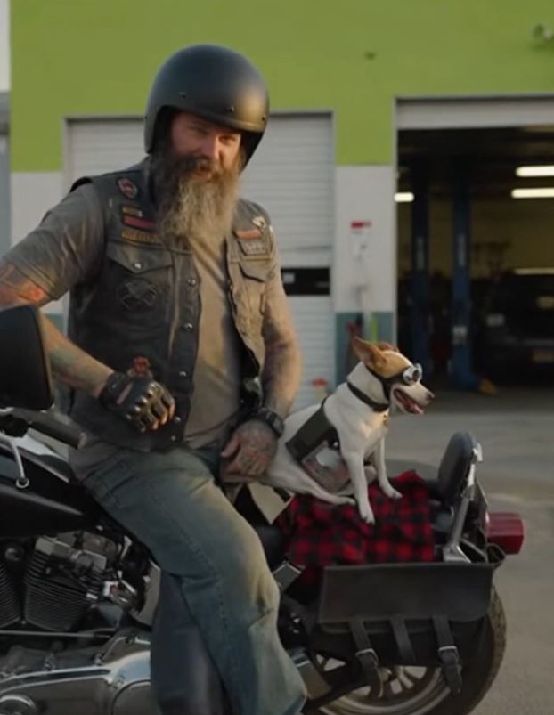 This little three-legged mutt hobbled out from behind his Harley like it owned the place. Muddy white fur, one ear permanently flopped. I figured it was a stray. Until he reached down, real gentle, and adjusted a tiny pair of doggy goggles on its face. No joke. Like it was second nature.