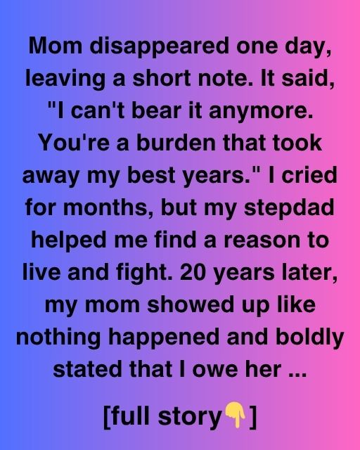 Mom disappeared one day, leaving a short note. It said, “I can’t bear it anymore. You’re a burden that took away my best years.” I cried for months, but my stepdad helped me find a reason to live and fight. 20 years later, my mom showed up like nothing happened and boldly stated that I owe her.