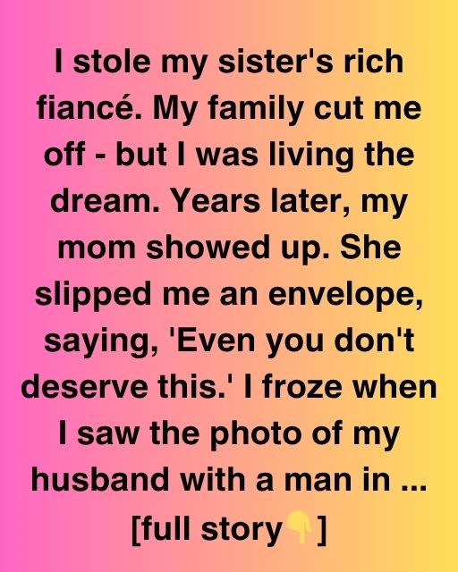 I stole my sister’s rich fiancé. My family cut me off — but I was living the dream. Years later, my mom showed up. She slipped me an envelope, saying, “Even you don’t deserve this.” I froze when I saw the photo of my husband with a man in bed.