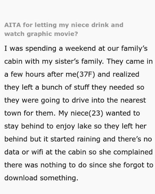 Our family cabin is my happy place, but for my 23-year-old niece, Talia, no internet is a special kind of torture. My sister, Clara, and her husband had to drive an hour back to town for supplies they’d forgotten, leaving a very grumpy Talia behind with me. When it started pouring rain, her plans to hang by the lake were shot, and the complaining began.