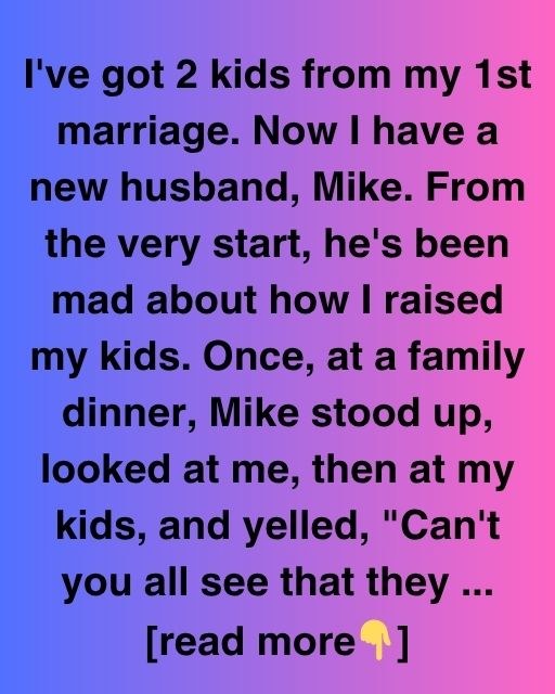 I’ve got 2 kids from my 1st marriage. Now I have a new husband, Mike. From the very start, he’s been mad about how I raised my kids. Once, at a family dinner, Mike stood up, looked at me, then at my kids, and yelled, ‘Can’t you all see that they walk all over her because she lets them!’