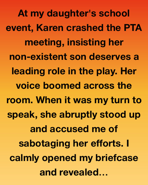 At my daughter’s school event, Karen crashed the PTA meeting, insisting her non-existent son deserves a leading role in the play. Her voice boomed across the room. When it was my turn to speak, she abruptly stood up and accused me of sabotaging her efforts. I calmly opened my briefcase and revealed the letter sent by the school confirming the role assignments, leaving Karen speechless momentarily.