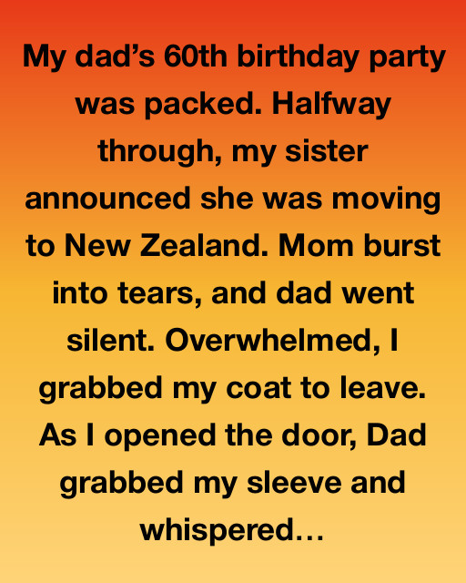 My dad’s 60th birthday party was packed. Halfway through, my sister announced she was moving to New Zealand. Mom burst into tears, and dad went silent. Overwhelmed, I grabbed my coat to leave. As I opened the door, Dad grabbed my sleeve and whispered, “Wait, there’s something you need to know.”