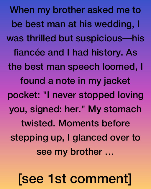 When my brother asked me to be best man at his wedding, I was thrilled but suspiciousโ€”his fiancรฉe and I had history. As the best man speech loomed, I found a note in my jacket pocket: “I never stopped loving you, signed: her.” My stomach twisted. Moments before stepping up, I glanced over to see my brother smiling at his bride, completely unaware of her secret note to me.