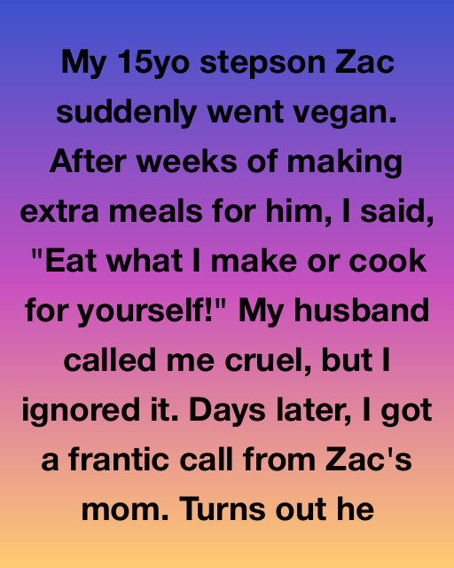 My 15-year-old stepson Zac suddenly went vegan. After weeks of making extra meals for him, I said, “Eat what I make or cook for yourself!” My husband called me cruel, but I ignored it. Days later, I got a frantic call from Zac’s mom. Turns out he had collapsed at school.