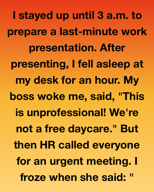 I stayed up until 3 a.m. to prepare a last-minute work presentation. After presenting, I fell asleep at my desk for an hour. My boss woke me, said, “This is unprofessional! We’re not a free daycare.” But then HR called everyone for an urgent meeting. I froze when she said: “We’re launching a full internal audit following an employee complaint. There have been serious allegations of misconduct at the management level.”