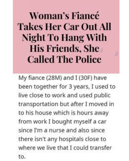 Last week, I went to bed early for a 12-hour shift. I woke up at 5 a.m. and the car was gone. No keys, no note, no texts. His phone went straight to voicemail.