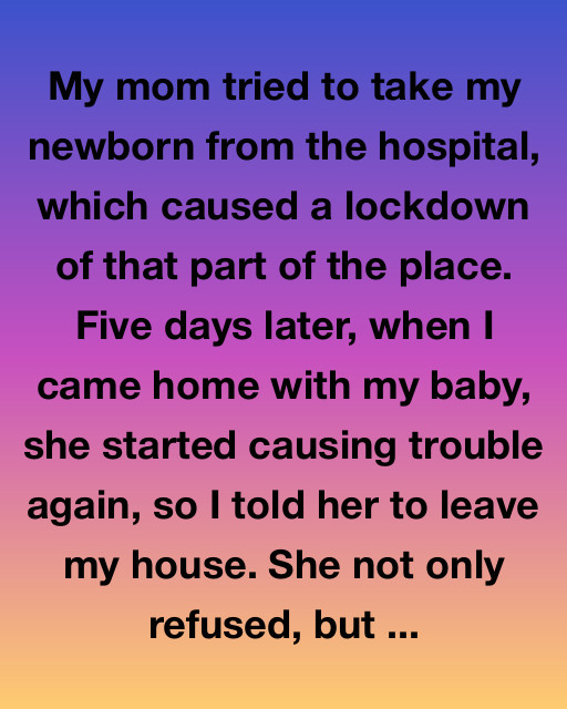 My mom tried to take my newborn from the hospital, which caused a lockdown of that part of the place. Five days later, when I came home with my baby, she started causing trouble again, so I told her to leave my house. She not only refused, but she locked herself in the guest room and said she wasn’t going anywhere.