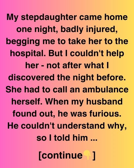 My stepdaughter came home one night, badly injured, begging me to take her to the hospital. But I couldn’t help her – not after what I discovered the night before. She had to call an ambulance herself. When my husband found out, he was furious. He couldn’t understand why, so I told him.