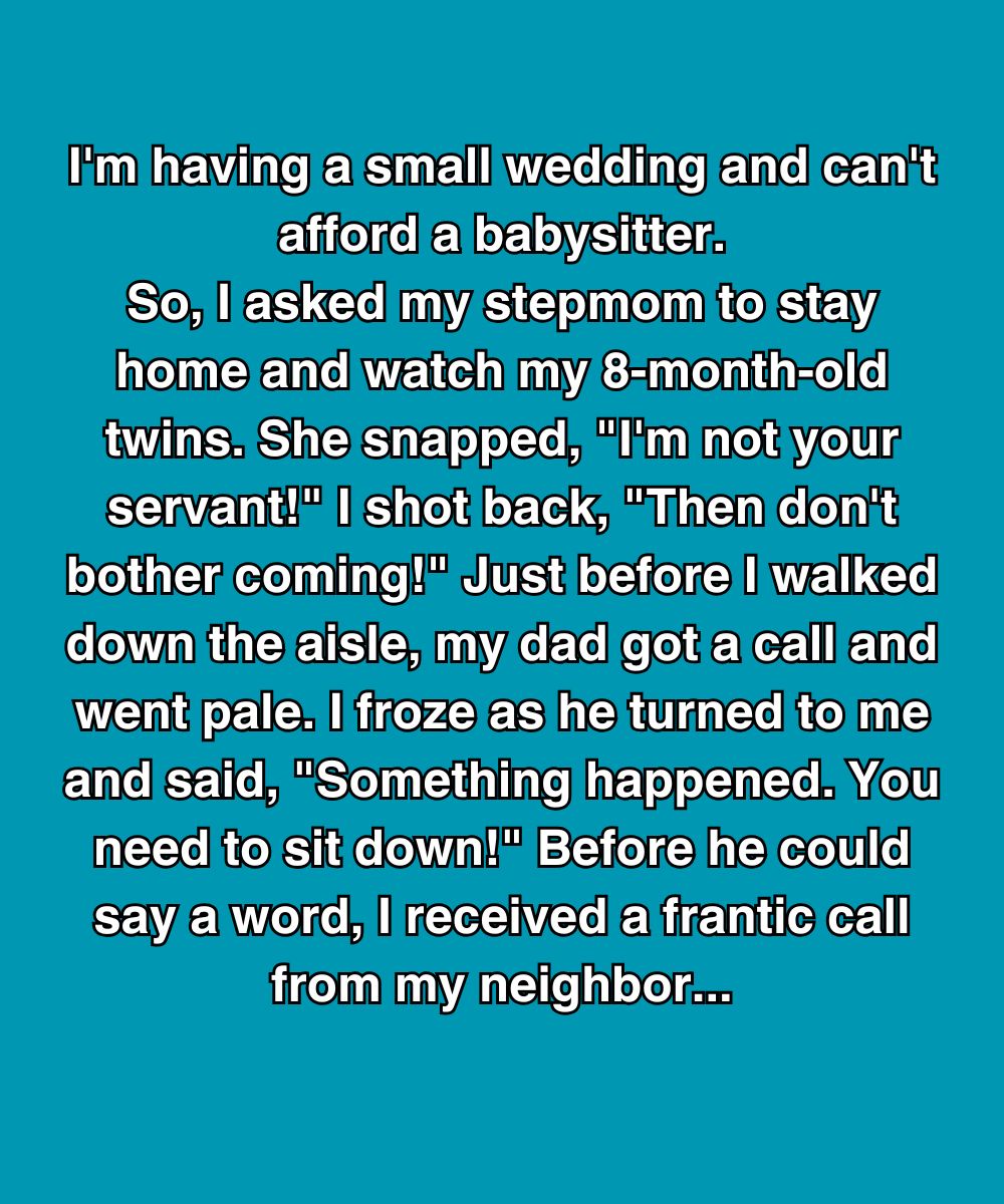 So, I asked my stepmom to stay home and watch my 8-month-old twins. She snapped, “I’m not your servant!” I shot back, “Then don’t bother coming!” Just before I walked down the aisle, my dad got a call and went pale. I froze as he turned to me and said, “Something happened. You need to sit down!” Before he could say a word, I received a frantic call from my neighbor…