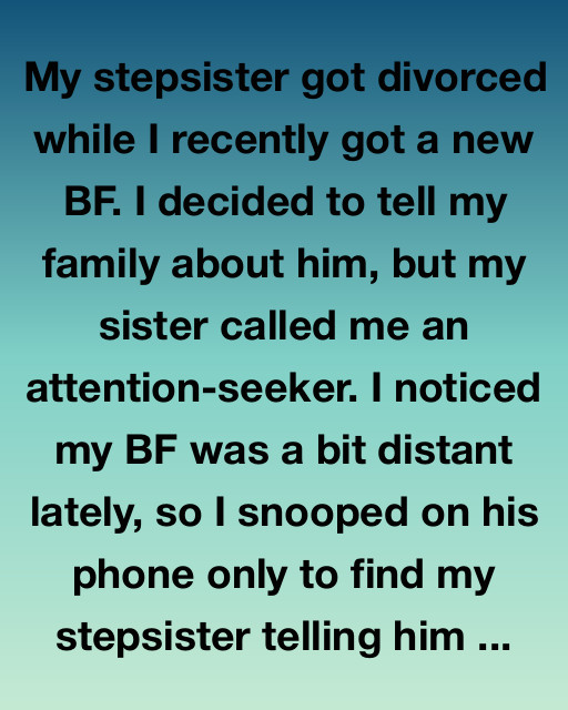 My stepsister got divorced while I recently got a new BF. I decided to tell my family about him, but my sister called me an attention-seeker. I noticed my BF was a bit distant lately, so I snooped on his phone only to find my stepsister telling him โ€œYou deserve someone real. Not someone whoโ€™s always performing for people.โ€