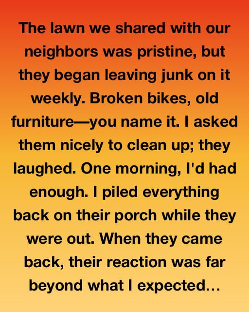 The lawn we shared with our neighbors was pristine, but they began leaving junk on it weekly. Broken bikes, old furnitureโyou name it. I asked them nicely to clean up; they laughed. One morning, I’d had enough. I piled everything back on their porch while they were out. When they came back, their reaction was far beyond what I expected.