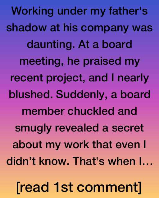 Working under my father’s shadow at his company was daunting. At a board meeting, he praised my recent project, and I nearly blushed. Suddenly, a board member chuckled and smugly revealed a secret about my work that even I didn’t know. That’s when I learned the prototype had been altered significantly in my absence, without my knowledge.