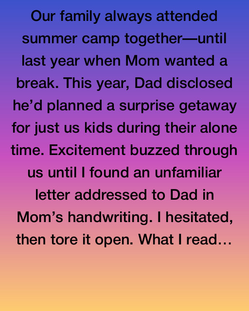 Our family always attended summer camp togetherโ€”until last year when Mom wanted a break. This year, Dad disclosed heโ€™d planned a surprise getaway for just us kids during their alone time. Excitement buzzed through us until I found an unfamiliar letter addressed to Dad in Momโ€™s handwriting. I hesitated, then tore it open. What I read made my heart race and my mind spin with curiosity.