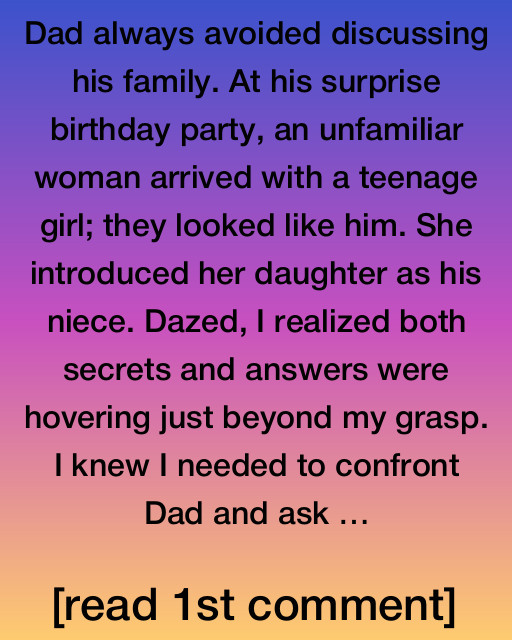 Dad always avoided discussing his family. At his surprise birthday party, an unfamiliar woman arrived with a teenage girl; they looked like him. She introduced her daughter as his niece. Dazed, I realized both secrets and answers were hovering just beyond my grasp. I knew I needed to confront Dad and ask what this meant for us.