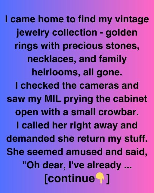 I came home to find my vintage jewelry collection – golden rings with precious stones, necklaces, and family heirlooms – all gone. I checked the cameras and saw my MIL prying the cabinet open with a small crowbar. I called her right away and demanded she return my stuff. She seemed amused and said, “Oh dear, I’ve already sold most of it.”