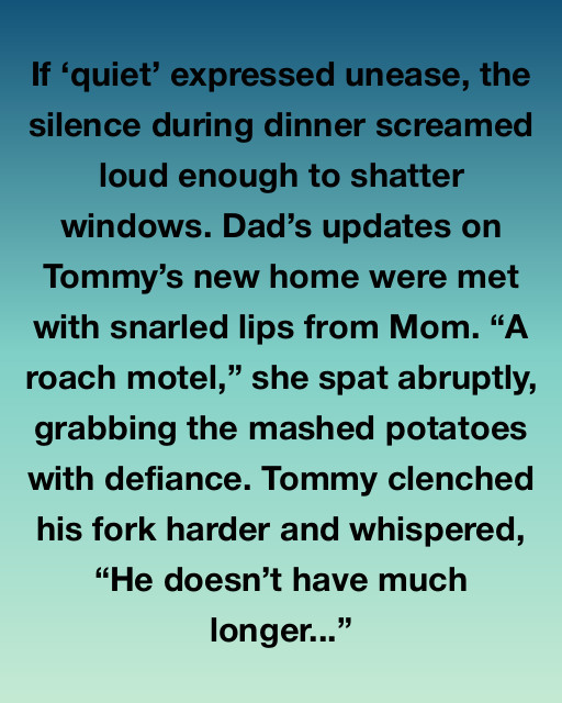 If ‘quiet’ expressed unease, the silence during dinner screamed loud enough to shatter windows. Dad’s updates on Tommy’s new home were met with snarled lips from Mom. “A roach motel,” she spat abruptly, grabbing the mashed potatoes with defiance. Tommy clenched his fork harder and whispered, “He doesn’t have much longer…”