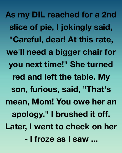 As my DIL reached for a 2nd slice of pie, I jokingly said, “Careful, dear! At this rate, we’ll need a bigger chair for you next time!” She turned red and left the table. My son, furious, said, “That’s mean, Mom! You owe her an apology.” I brushed it off. Later, I went to check on her — I froze as I saw her sitting on the edge of the guest bed, holding back tears, a half-folded piece of paper in her hands.