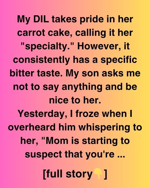 My DIL takes pride in her carrot cake, calling it her “specialty.” However, it consistently has a specific bitter taste. My son asks me not to say anything and be nice to her. Yesterday, I froze when I overheard him whispering to her, “Mom is starting to suspect that you’re…”
