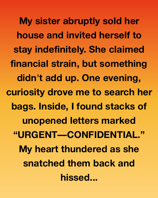 My sister abruptly sold her house and invited herself to stay indefinitely. She claimed financial strain, but something didn’t add up. One evening, curiosity drove me to search her bags. Inside, I found stacks of unopened letters marked โURGENTโCONFIDENTIAL.โ My heart thundered as she snatched them back and hissed, โStay out of my business!โ Her eyes were wild, like she was hiding a deep secret, one that had been eating her alive.
